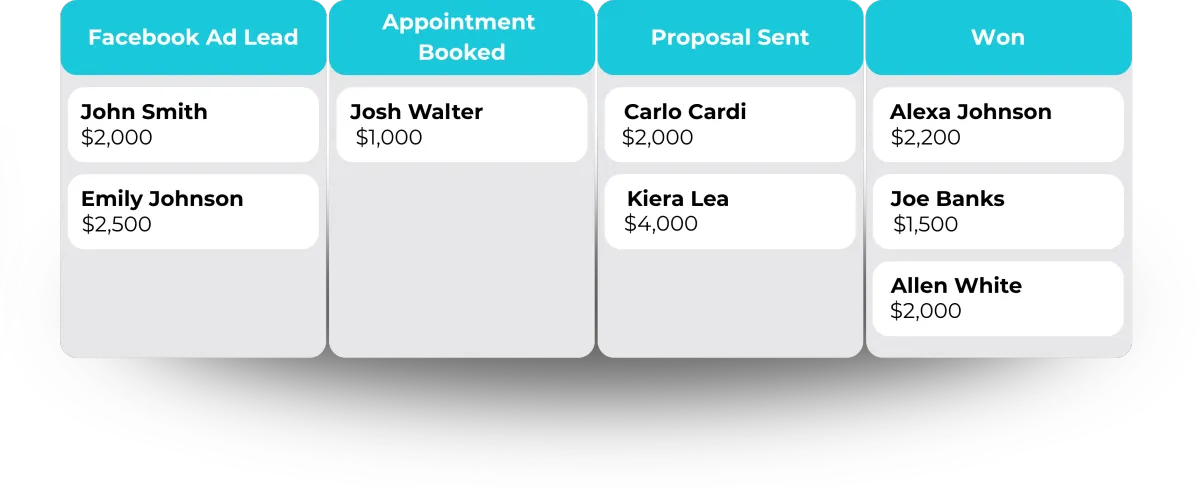 Track every lead from first contact to closing. Visual pipelines help you see exactly where each client is in the process and their $ value.
